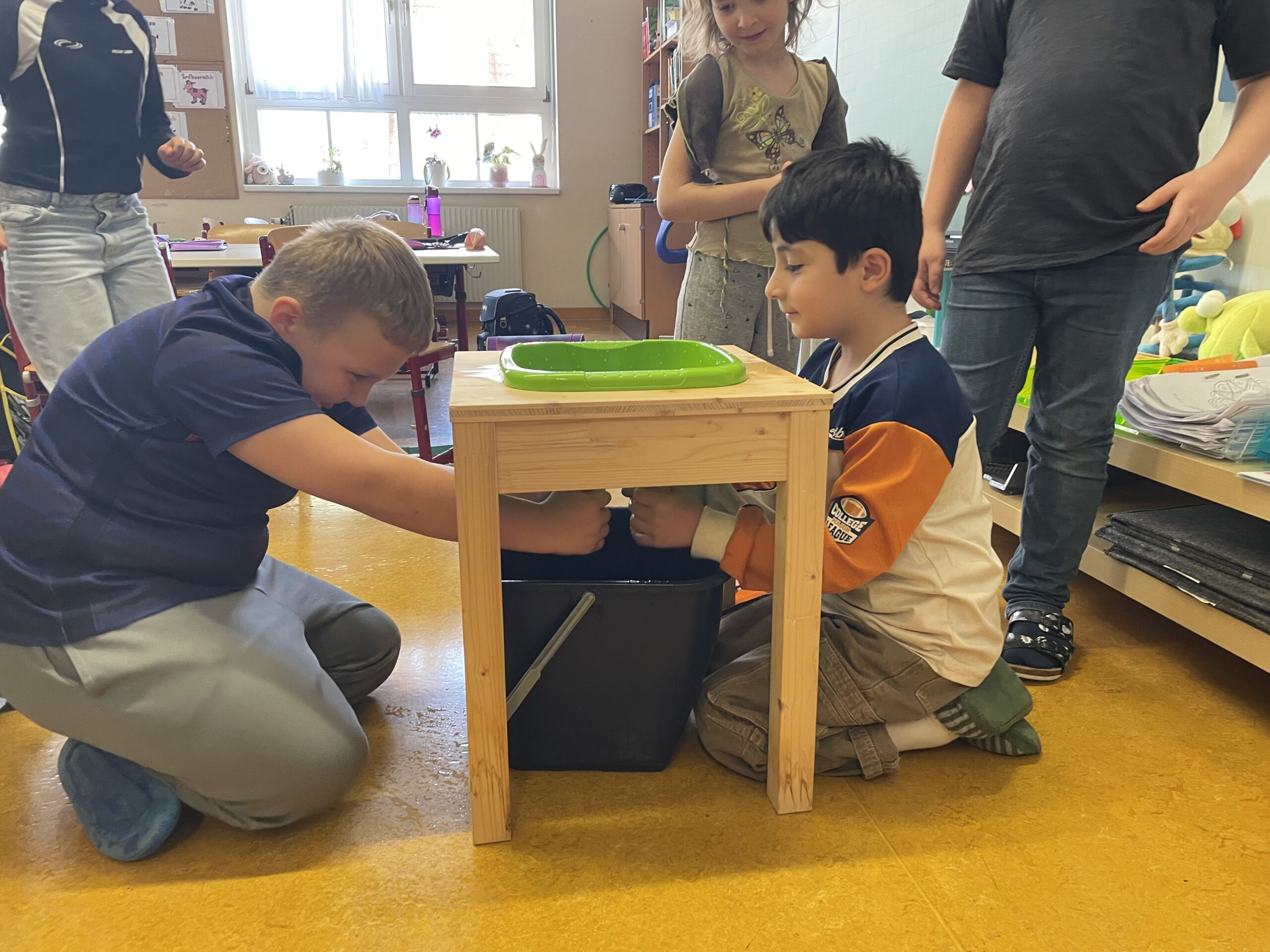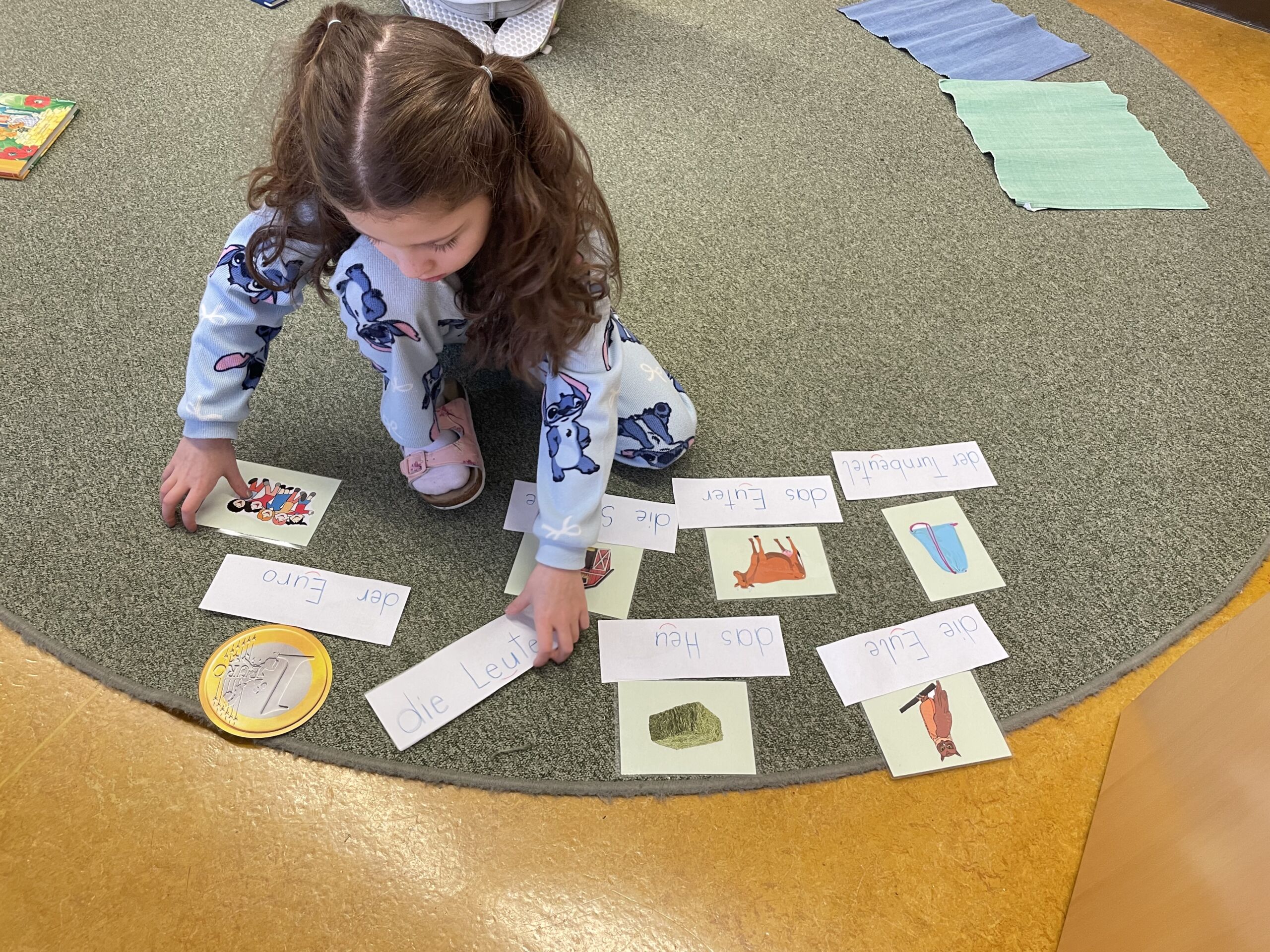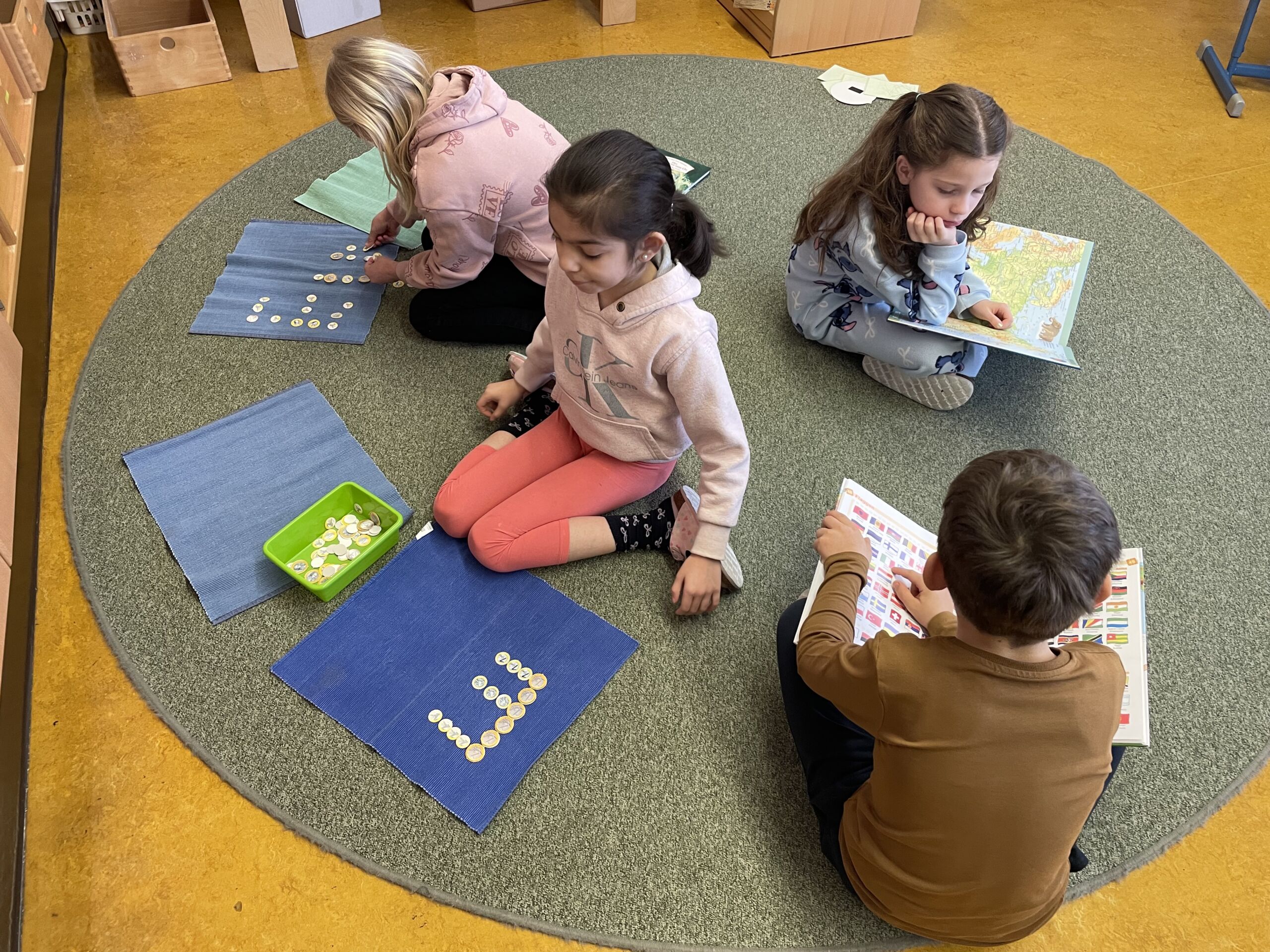 Der Buchstabentag zum Eu und eu war geprägt von Eulen, dem Euter und Euros. So konnten Deutsch- und Mathematik-Stationen kombiniert werden. Es gab viele Legearbeiten mit Euros, die auch am Gang und in der Aula Platz fanden. Das Highlight des Tages war aber der Melkschemel mit dem Euter. Fleißig melkten die Kinder und hatten viel Spaß dabei!