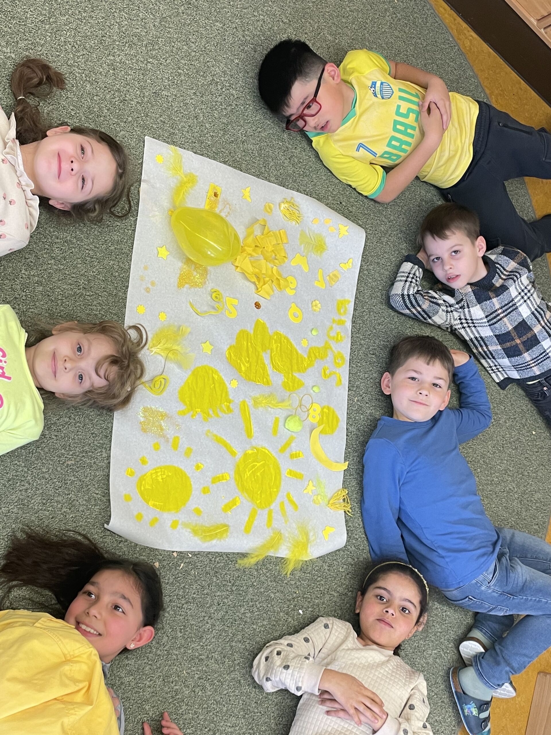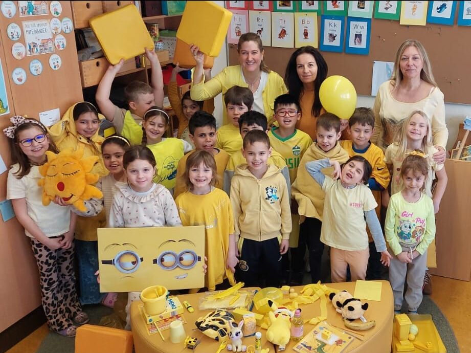 Weiter ging es am nächsten Tag mit der Farbe GELB. Die 1b in ein „gelbes Zimmer“ zu verwandeln war gar nicht so einfach. Aber durch die engagierte Mithilfe der Eltern sind auch an diesem Tag ein sehr sonniges Foto und Plakat entstanden.