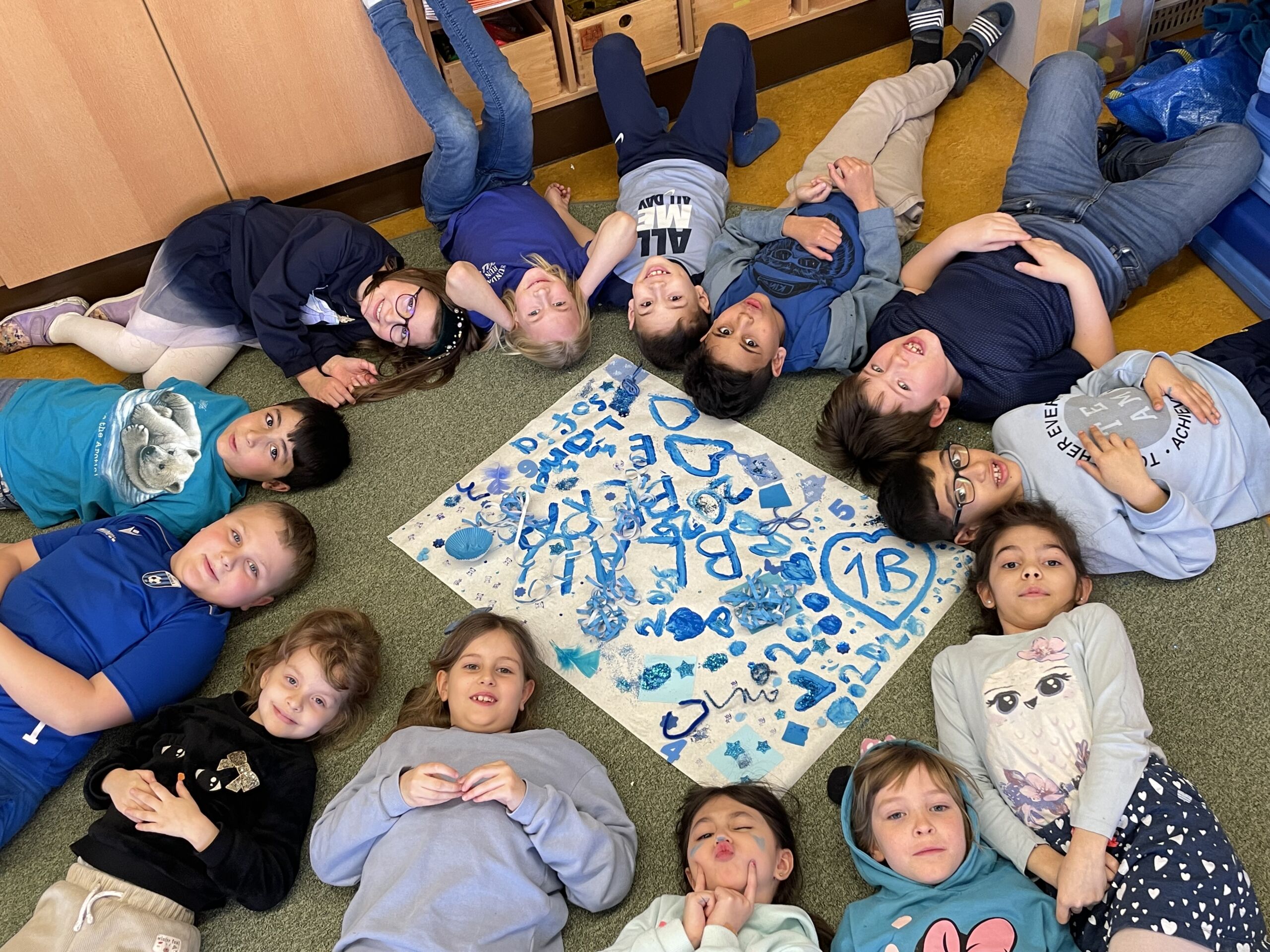 Als nächstes lernten die Buben und Mädchen den Künstler „Joel Hubaut“ kennen, der ganze Plätze und Zimmer in einer ganz bestimmten Farbe gestaltete. Angelehnt an diese Kunstwerke kamen alle Schüler und Lehrer am Donnerstag in BLAU gekleidet und brachten viele blaue Gegenstände mit. So konnte eine blaue Perfomance gestaltet werden und ein tolles Foto und ein Plakat entstanden.