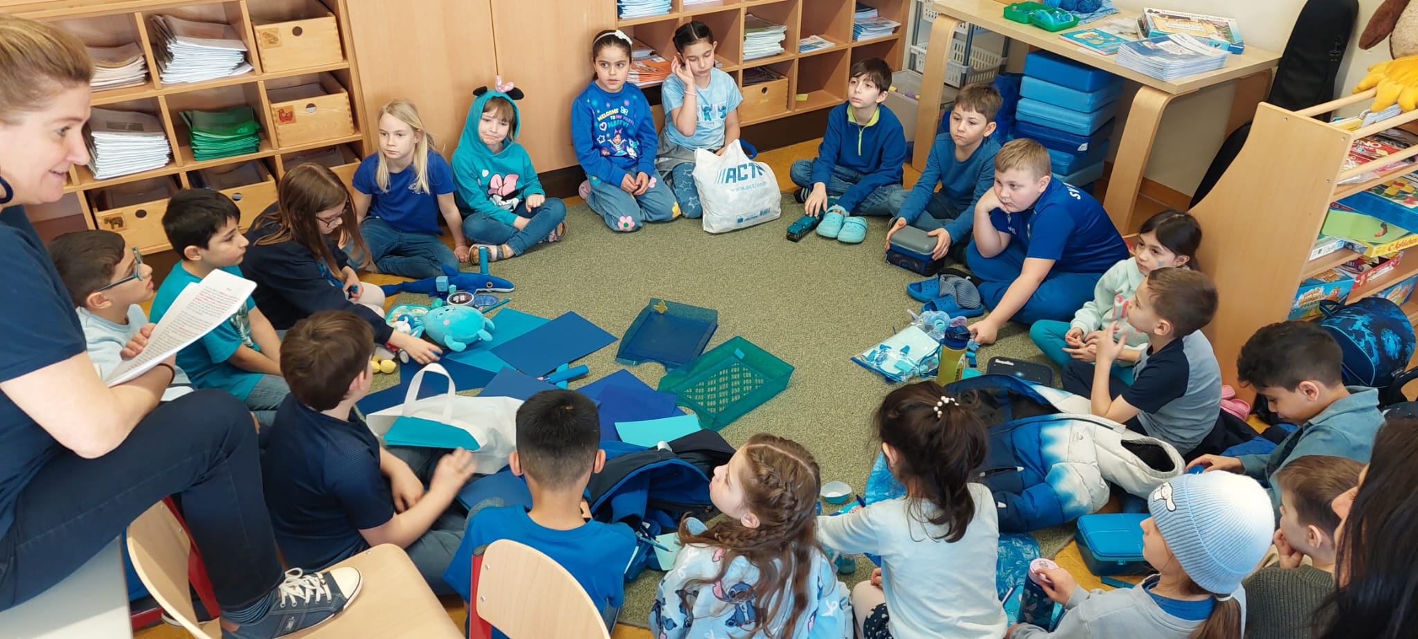 Die 1b startete diese Woche in ein dreiwöchiges Farbenprojekt. Zu Beginn beschäftigten sich die Kinder mit dem Farbkreis von Johannes von Itten. Sie lernten über die Grund- und Sekundärfarben und gestalteten mit Hilfe von mitgebrachten Prospekten in Gruppenarbeiten eigene Farbkreise.