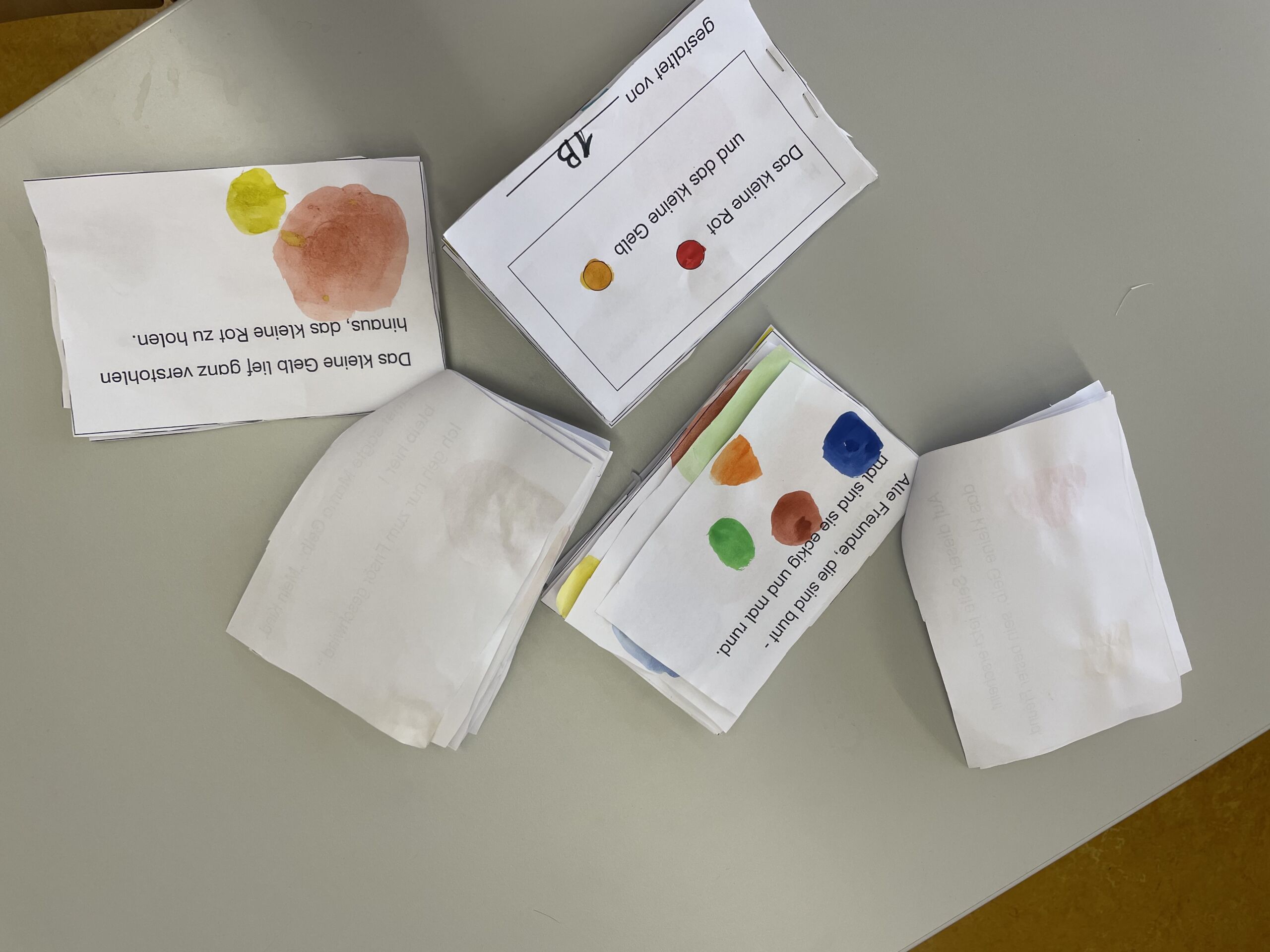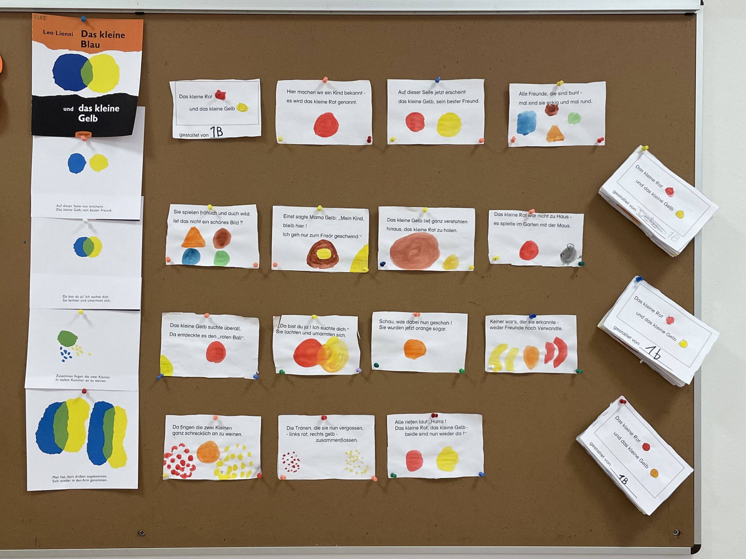 In der zweiten Woche beschäftigten sich die Kinder der 1b mit 2 Büchern, in denen es um das Thema „Farben“ geht. Gespannt horchten die Buben und Mädchen, wohin das kleine Blau und das kleine Gelb verschwunden sind. In Anlehnung an dieses Buch gestaltete die ganze Klasse gemeinsam ein Buch mit dem Titel „Das kleine Gelb und das kleine Rot“. Stolz präsentierten sie die fertigen Bücher.