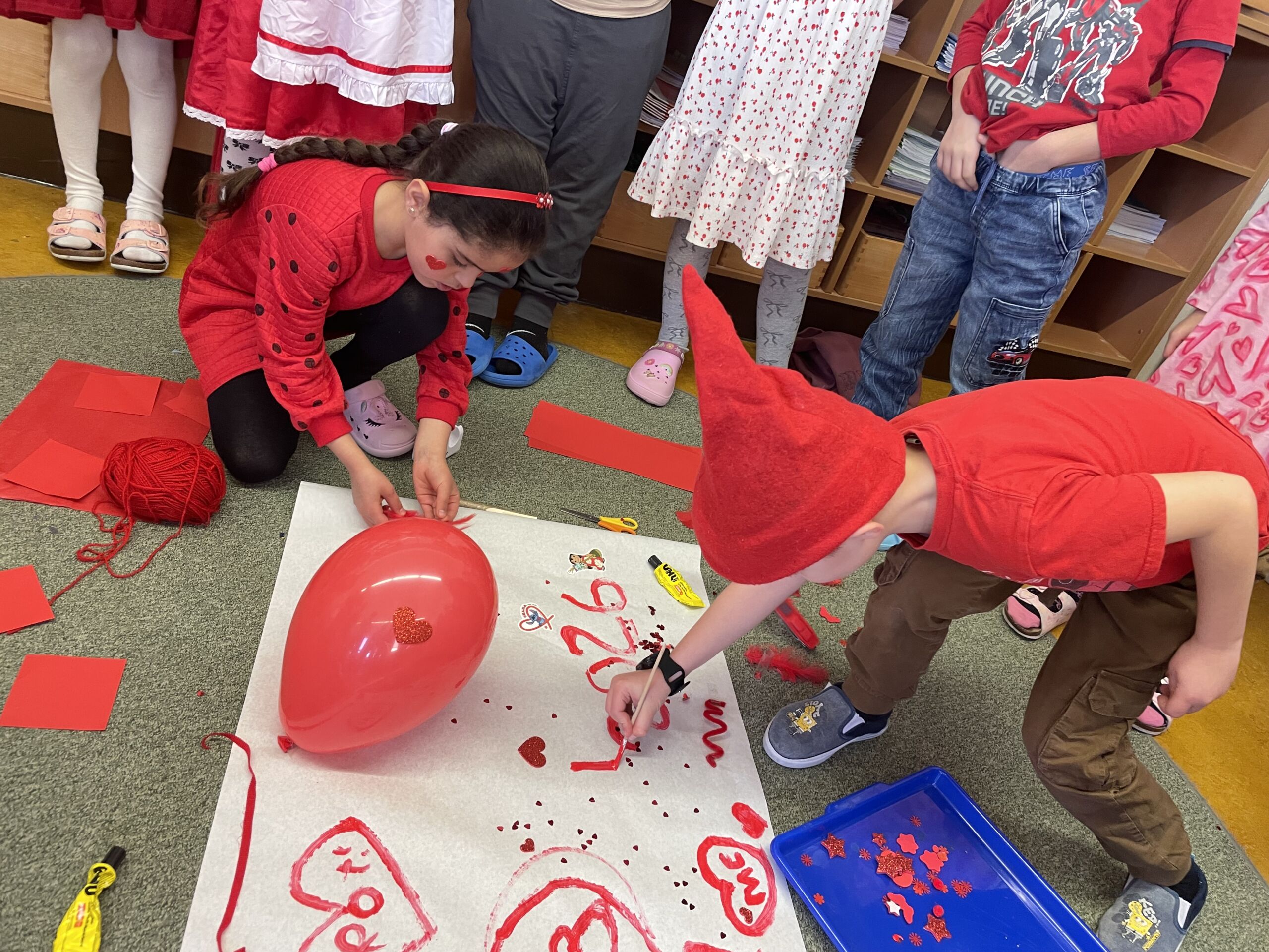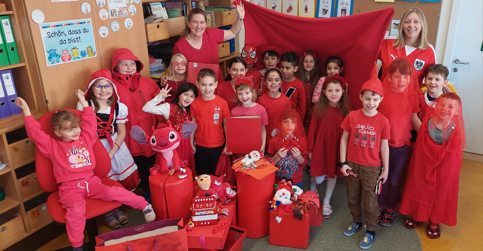 Am Donnerstag wurde die ganze Klasse in ROT gehüllt. Die Kinder waren ROT gekleidet und haben viele Gegenstände mitgebracht. Das Foto und das Plakat in leuchtendem ROT begeisterte alle Kinder (und Erwachsenen).