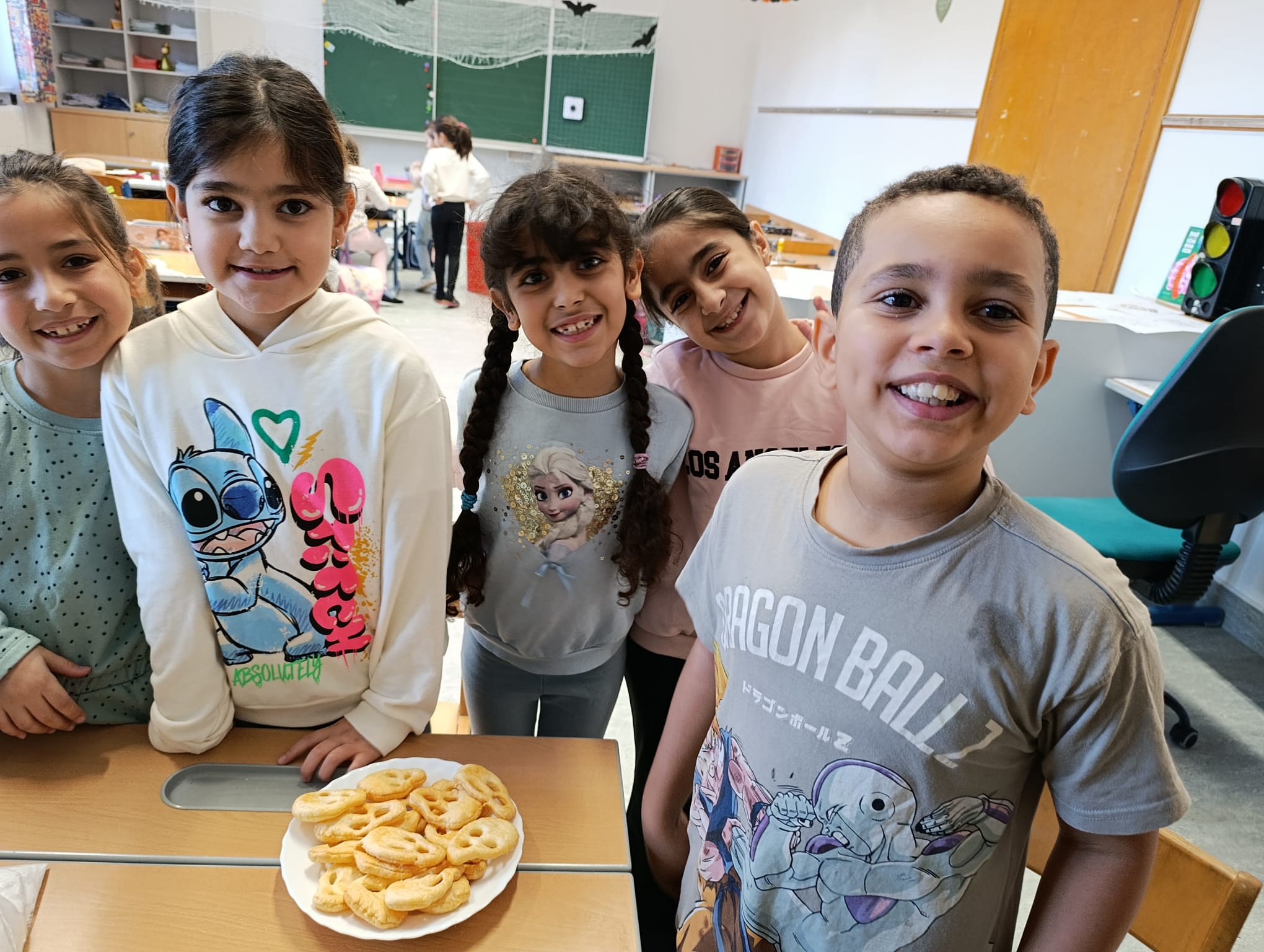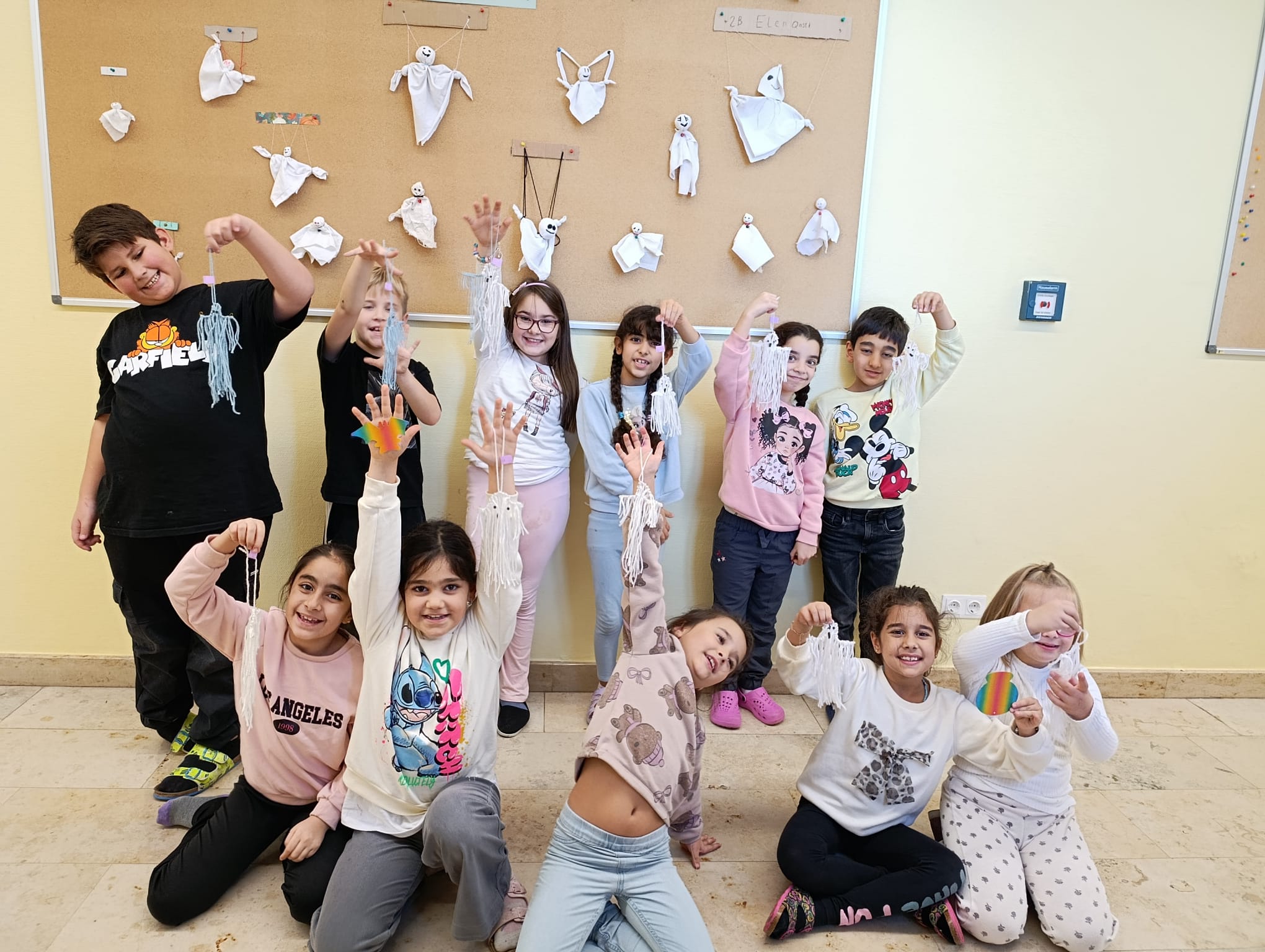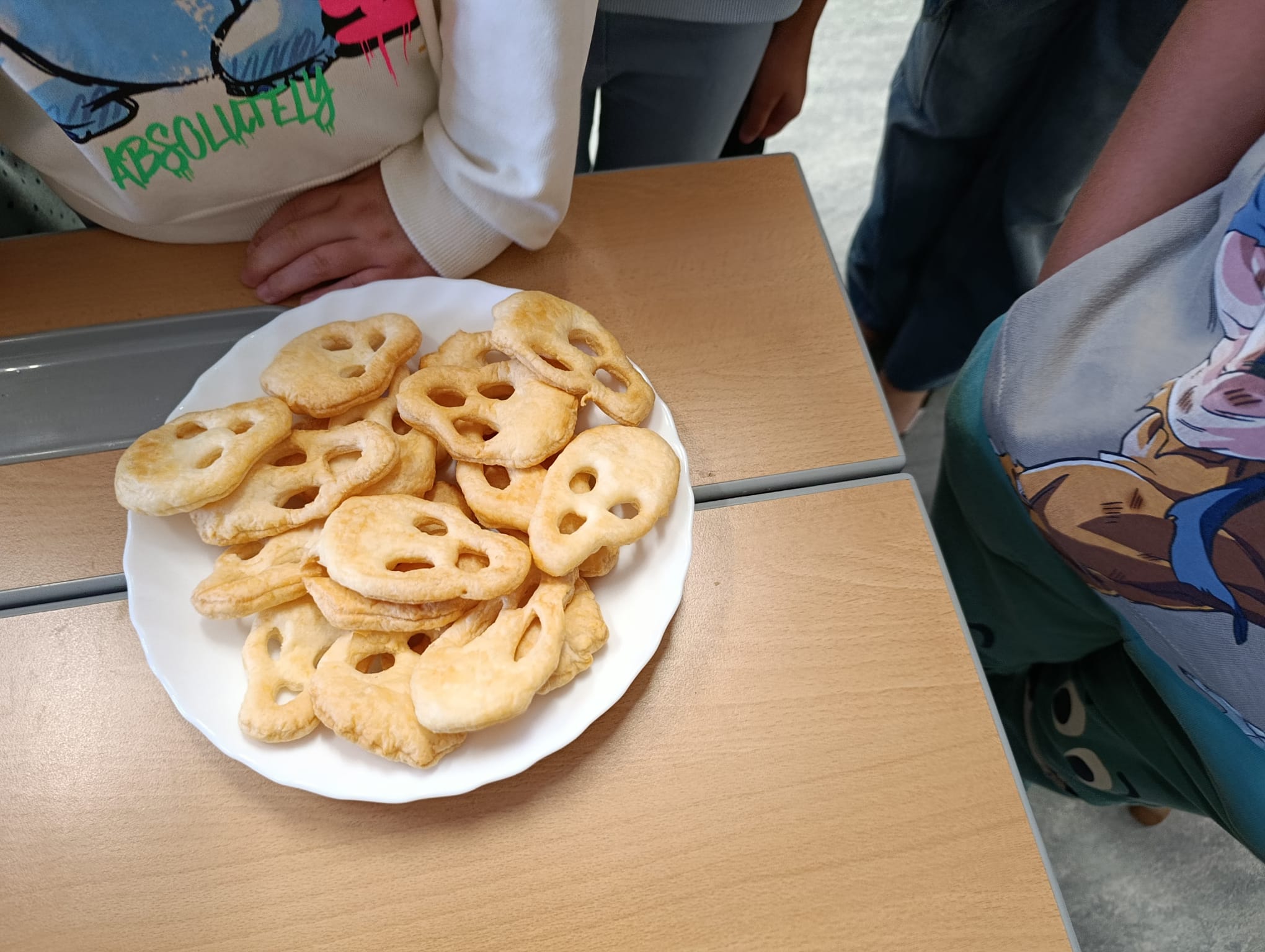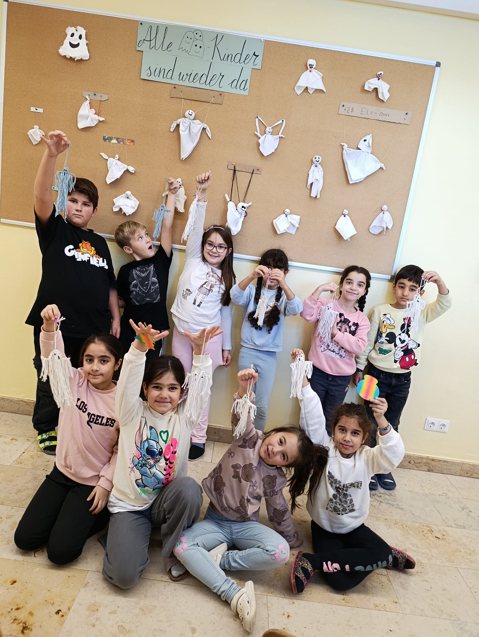Am 24.10. machten wir uns einen gemütlichen Tag in der Schule. Nach der Aufregung vom Tag der offenen Tür am Vortag, drehte sich heute alles um die gruselige Zeit. Wir bastelten Gespenster aus Draht und Wollfäden, buken Totenköpfe aus Blätterteig, zeichneten Gruselschlösser und lernten einen Becherrhythmus zu einer gruseligen Melodie. Nun freuen wir uns auf die Herbstferien und wünschen allen eine erholsame Zeit!