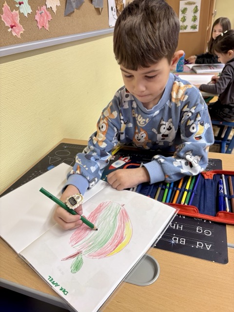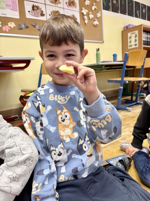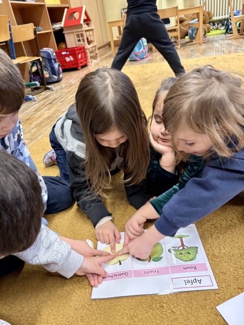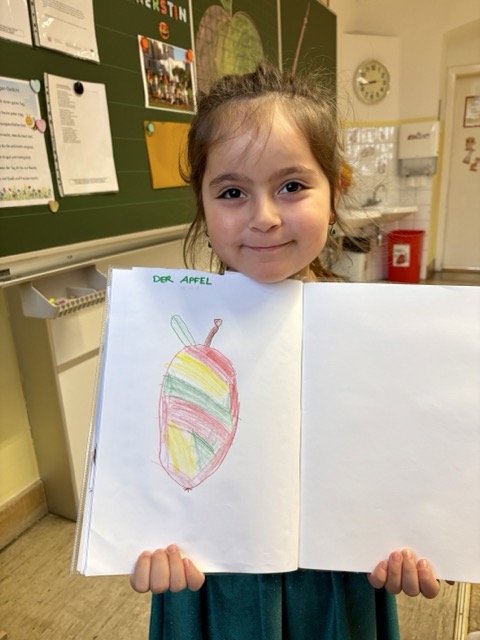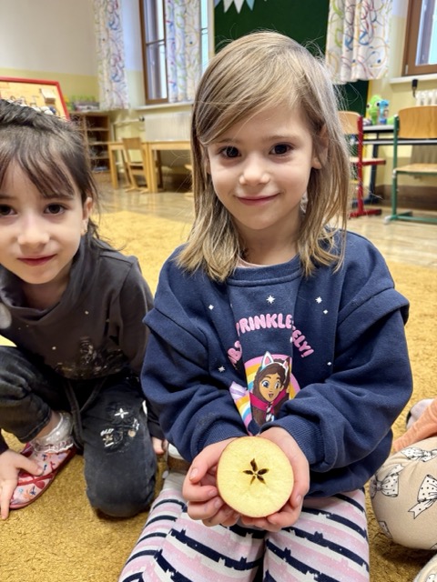 Am heutigen Tag des Apfels befassten sich unsere Vorschüler:innen ganz sorgfältig mit der leckeren Frucht. Der Apfel wurde von außen und innen genau betrachtet, untersucht, zerteilt, gekostet, gemalt, … Natürlich wissen die Kinder bereits, dass der Apfel mit einem großen A beginnt – A wie Apfel!