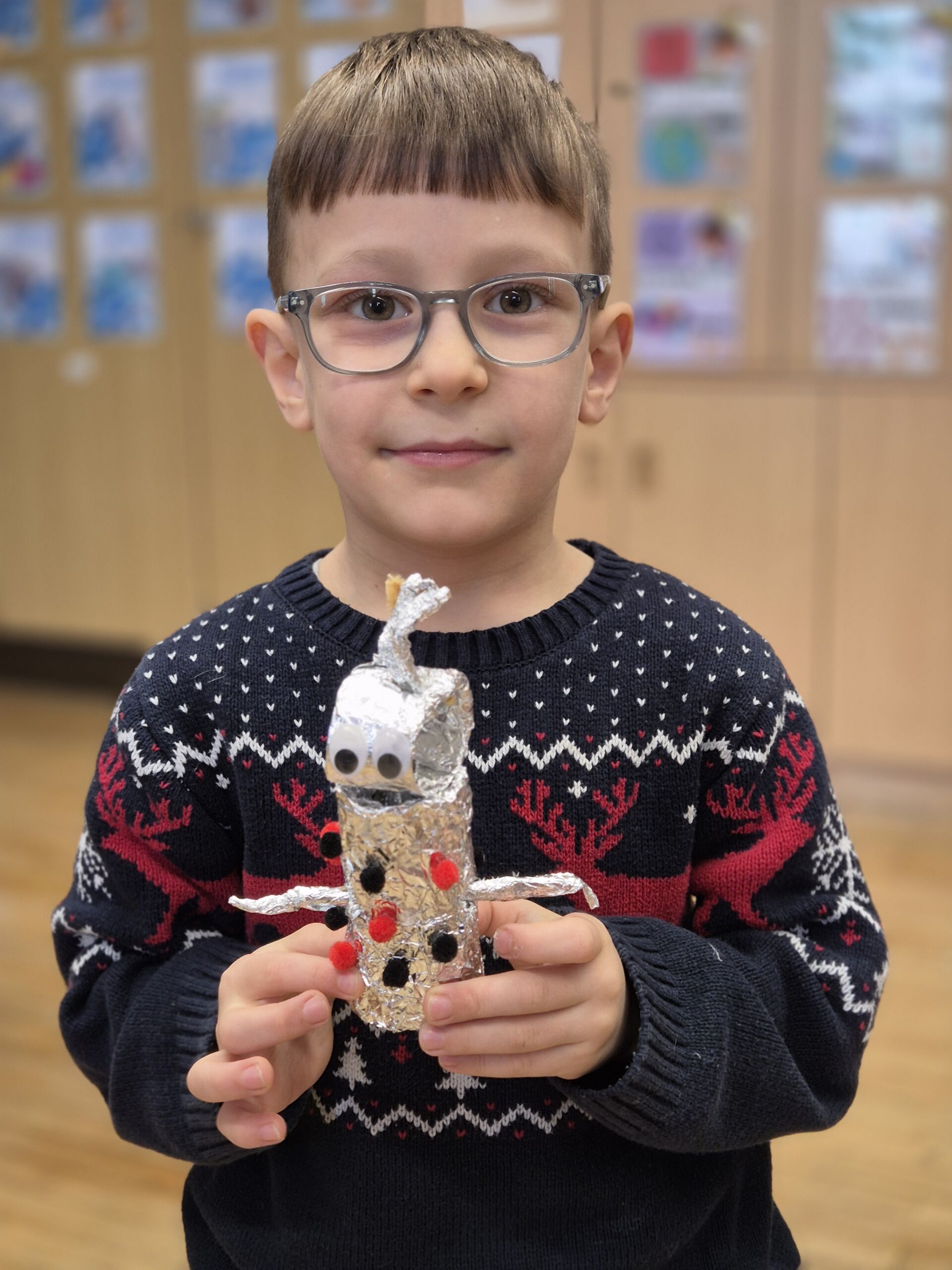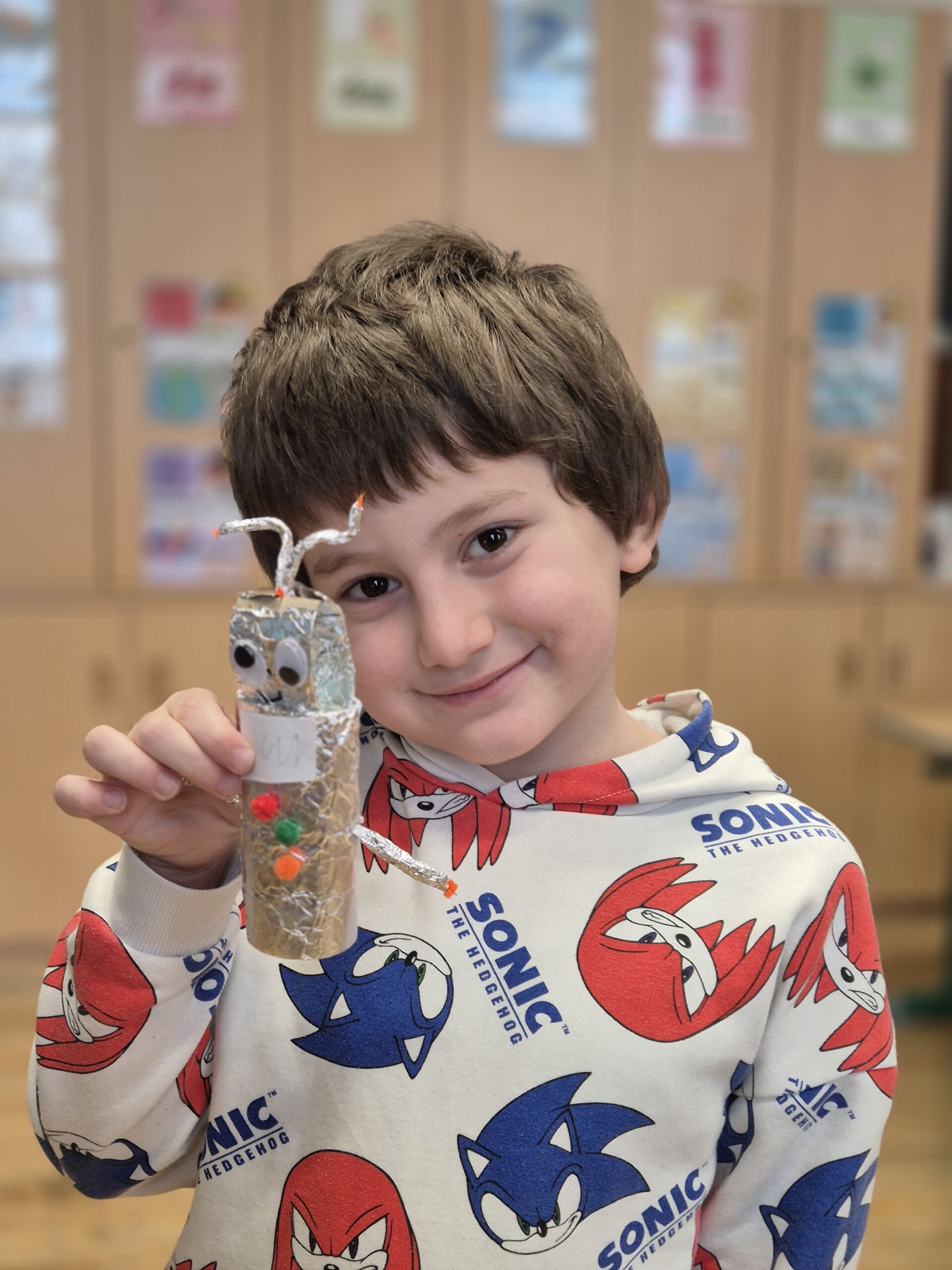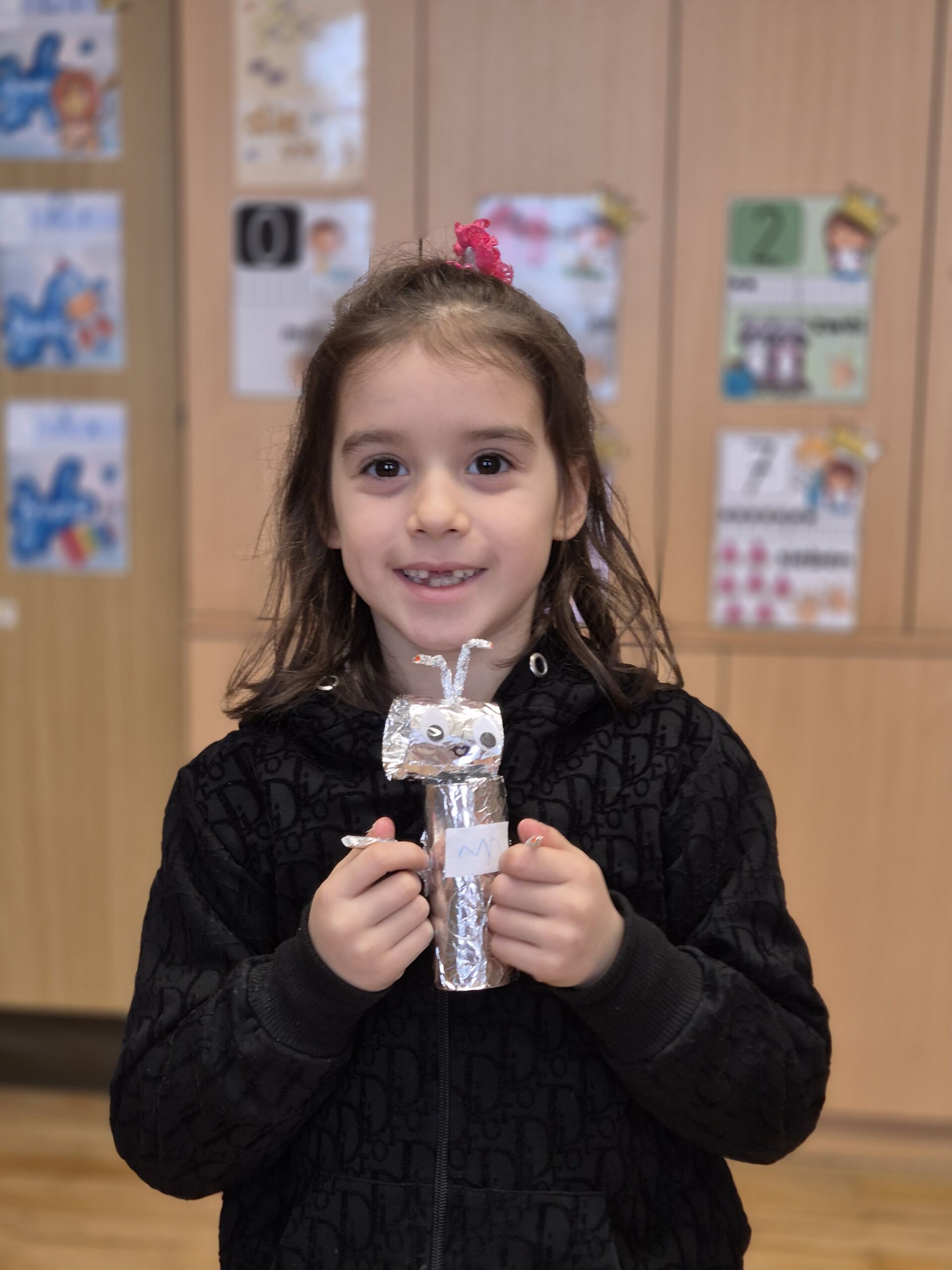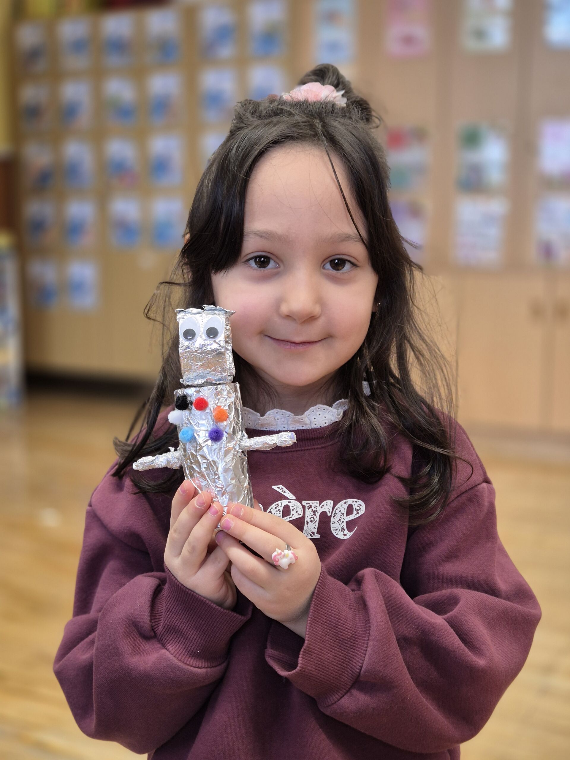 Die Kinder der Vorschulklasse 2 bastelten lustige Roboter aus Klopapierrollen und Alufolie. Zuerst kleideten wir Klopapierrollen, Strohhalme und Pfeifenputzer in Alufolie ein. Anschließend wurde alles zurechtgeschnitten und richtig zusammen gesetzt. Zum Schluss wurden die Roboter verziert.