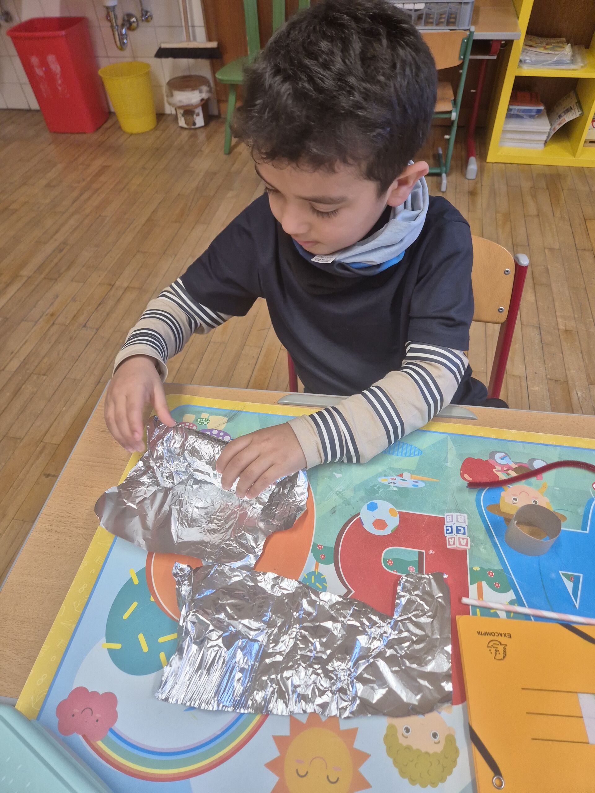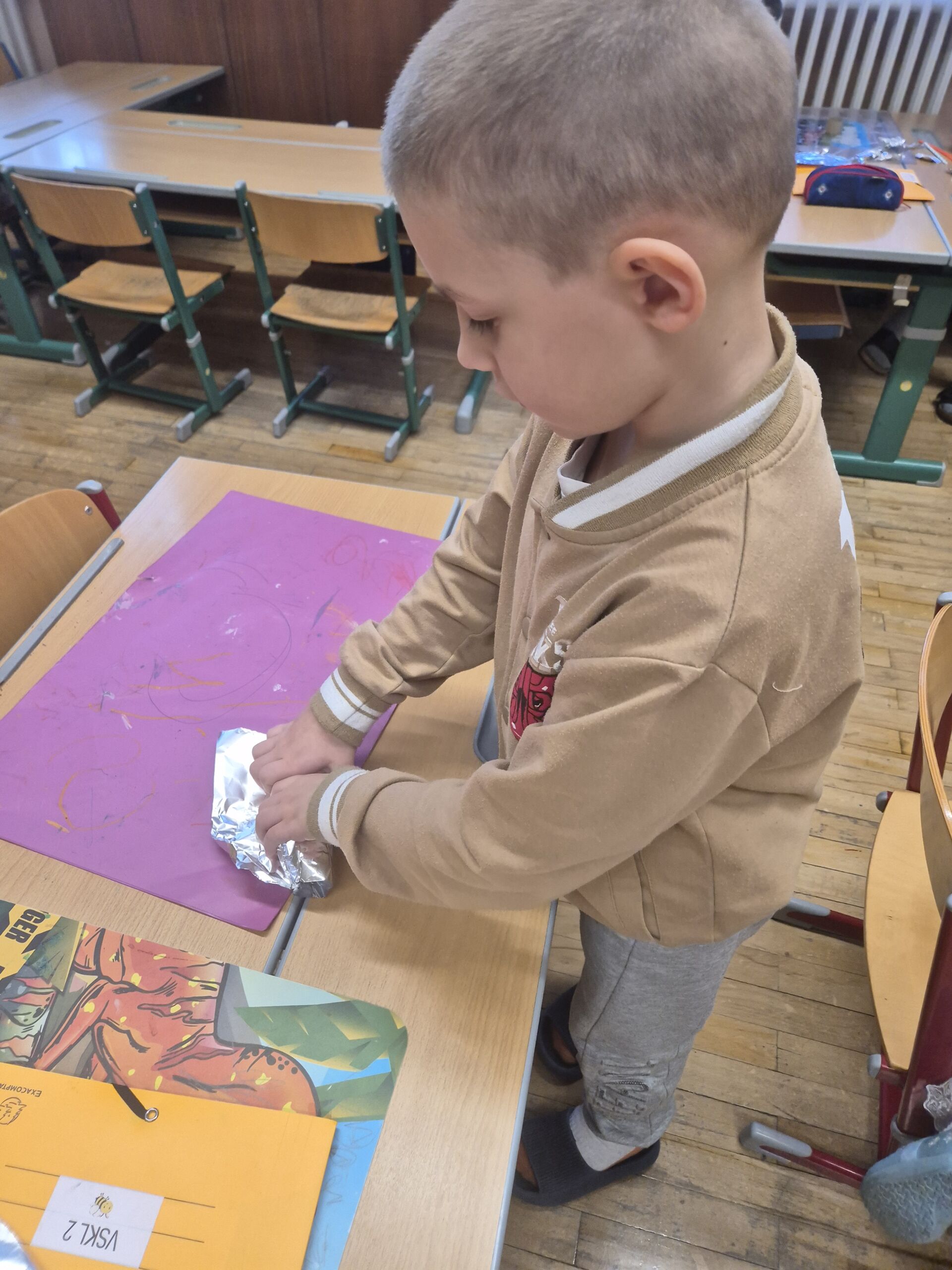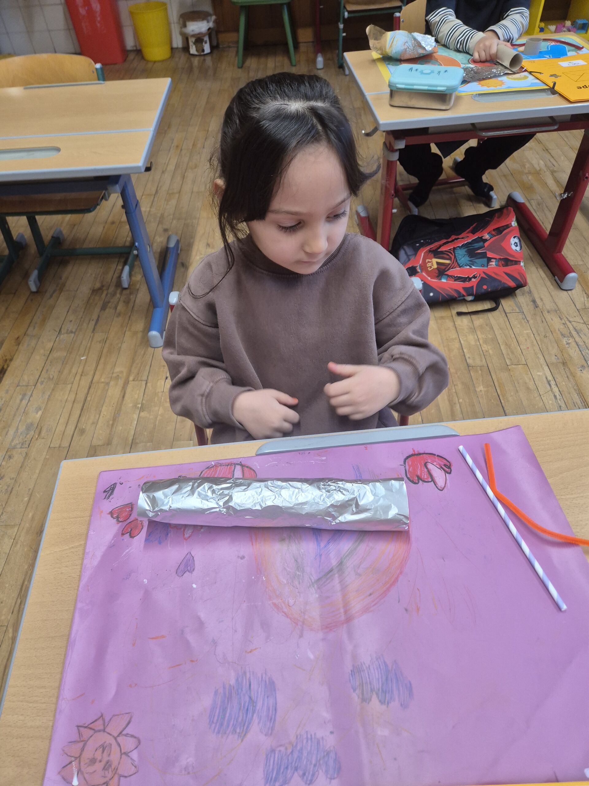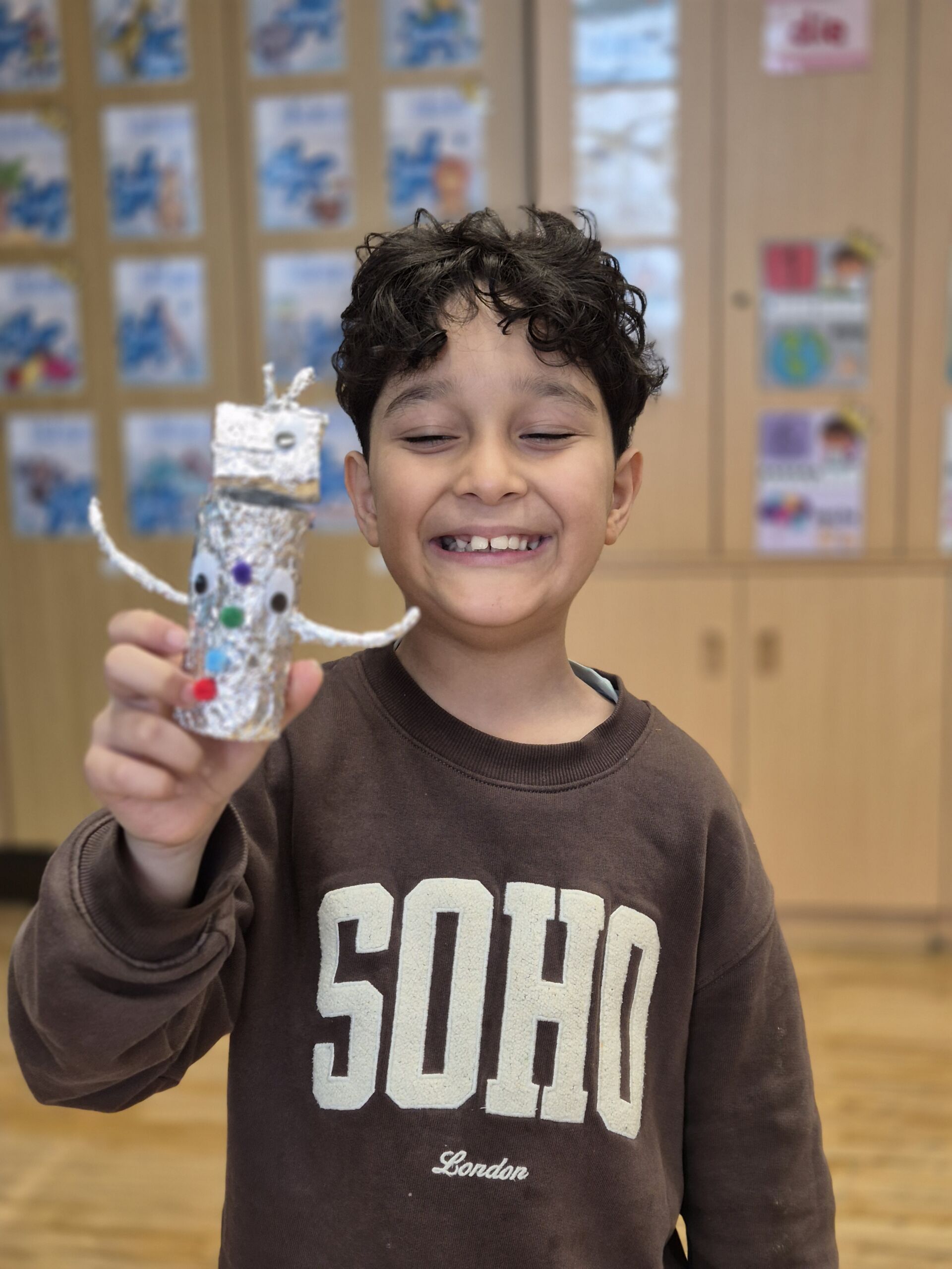 Die Kinder der Vorschulklasse 2 bastelten lustige Roboter aus Klopapierrollen und Alufolie. Zuerst kleideten wir Klopapierrollen, Strohhalme und Pfeifenputzer in Alufolie ein. Anschließend wurde alles zurechtgeschnitten und richtig zusammen gesetzt. Zum Schluss wurden die Roboter verziert.