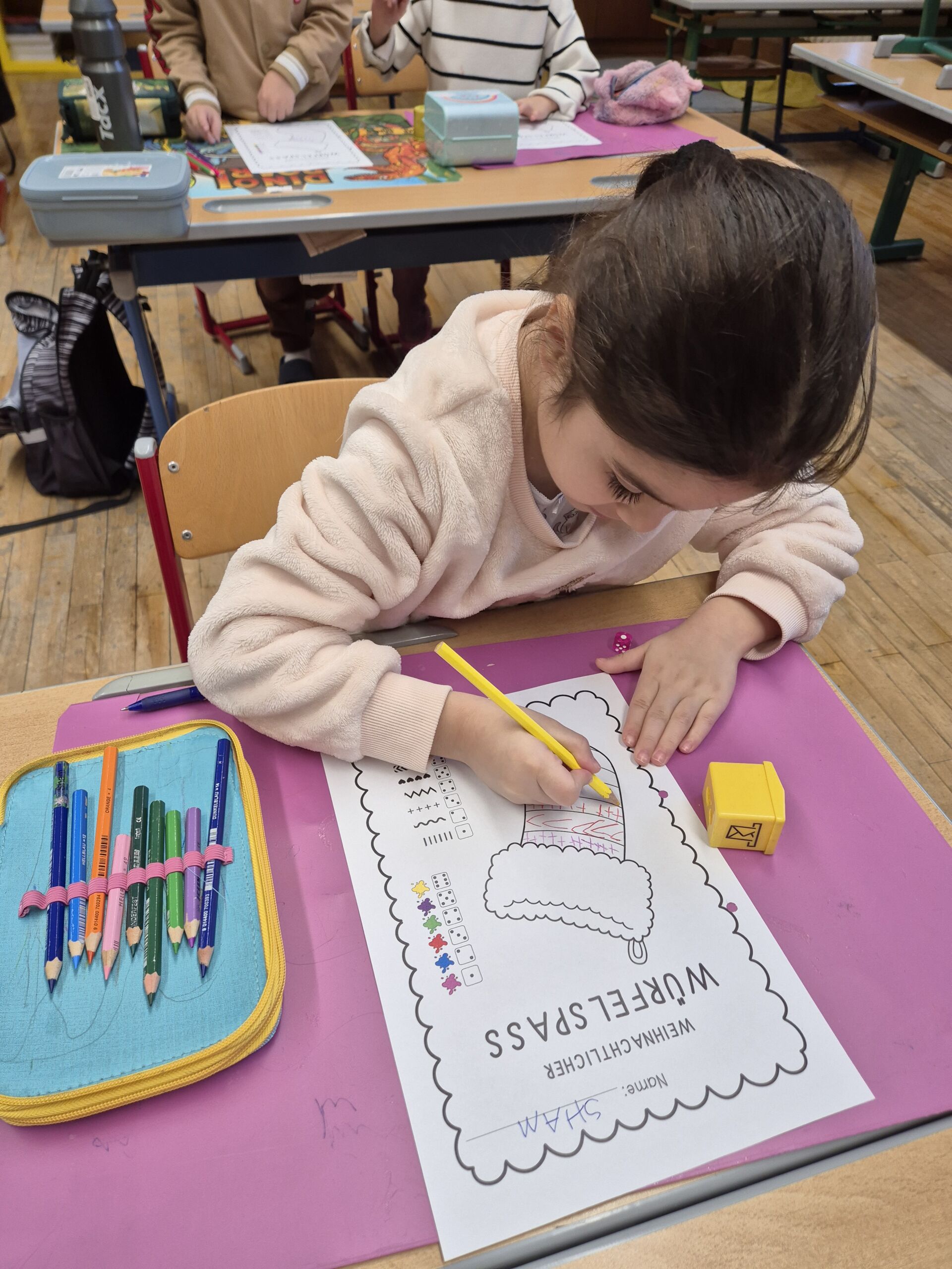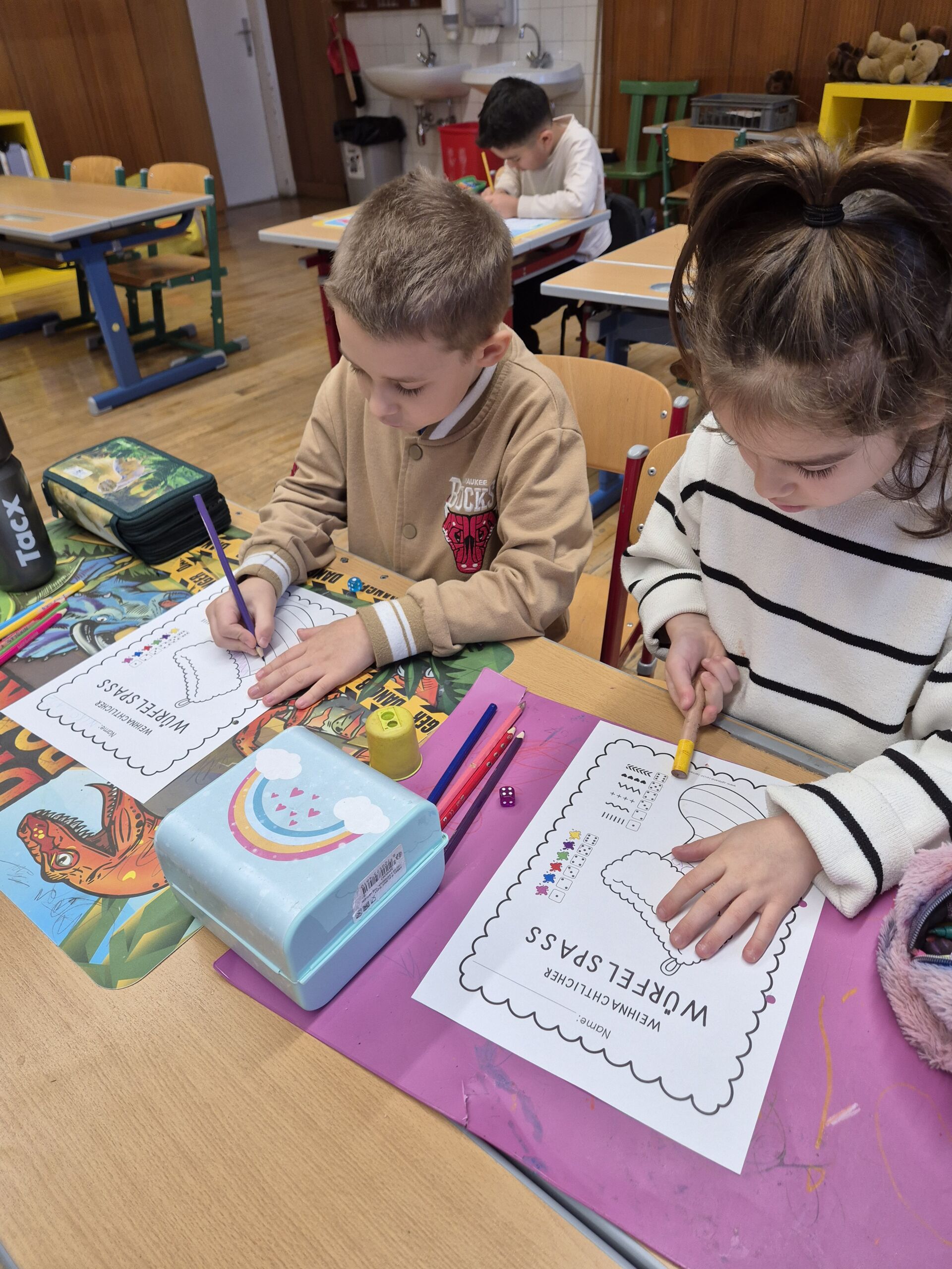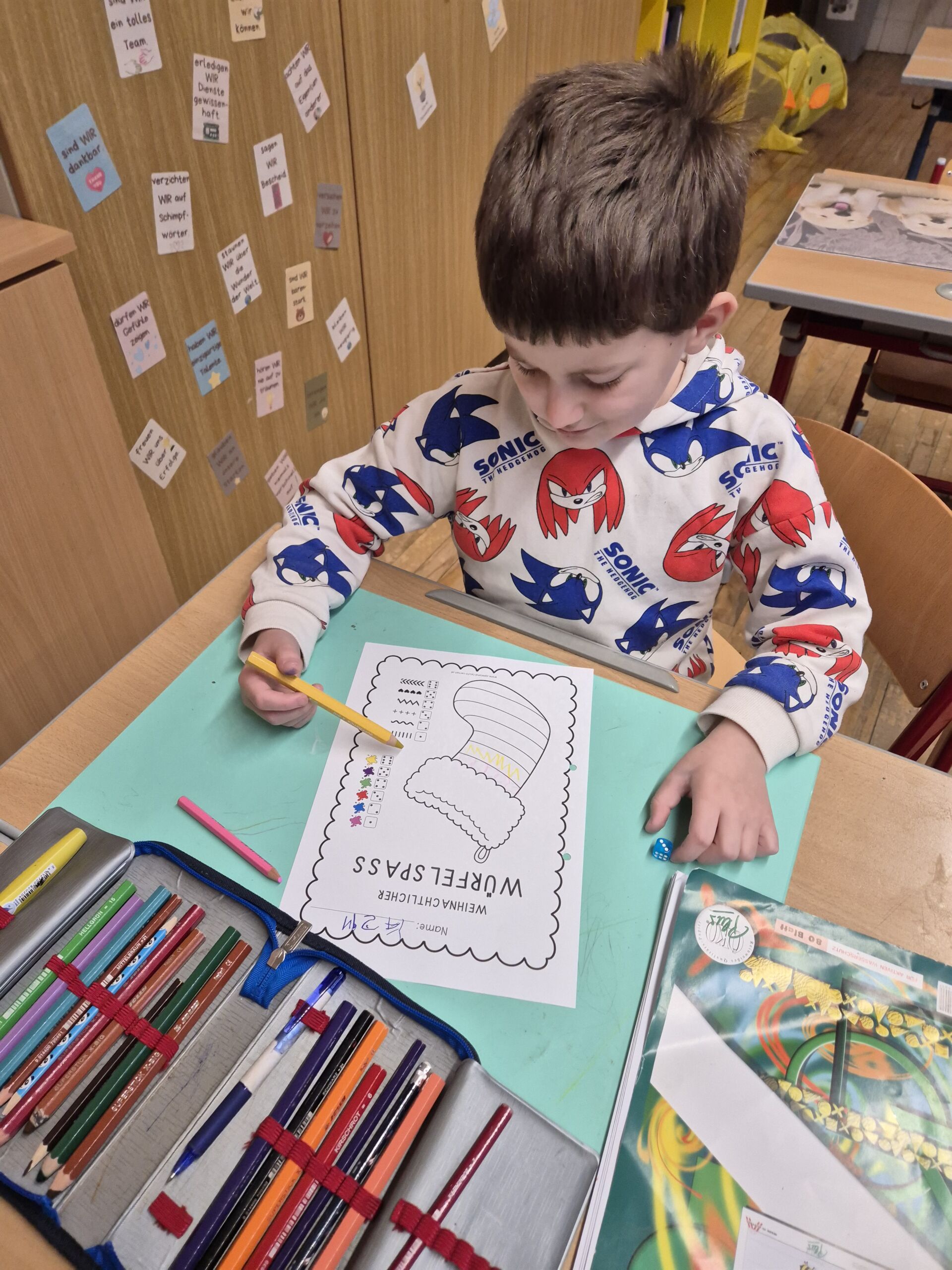 Die Kinder der Vorschulklasse 2 festigten den Zahlenraum 6 auf spielerische Weise. Zusätzlich zu der Erarbeitung der Ziffern, haben wir auch die Würfelbilder gelernt. Heute gestalteten wir grapho-motorisch einen Weihnachtssocken. Durch das Würfeln bekamen wir eine Angabe, in welcher Farbe und mit welchem Muster der Socken gestaltet werden soll. So hatte am Schluss jedes Kind ein individuell gestaltetes Werk.