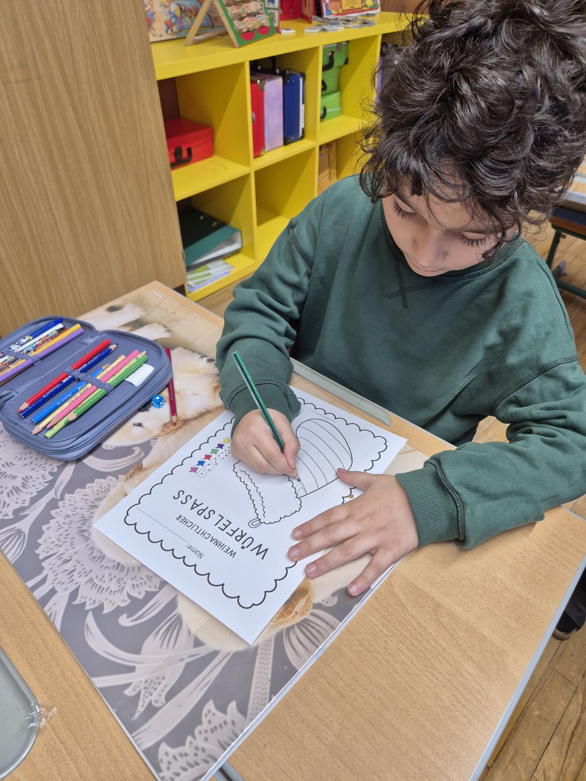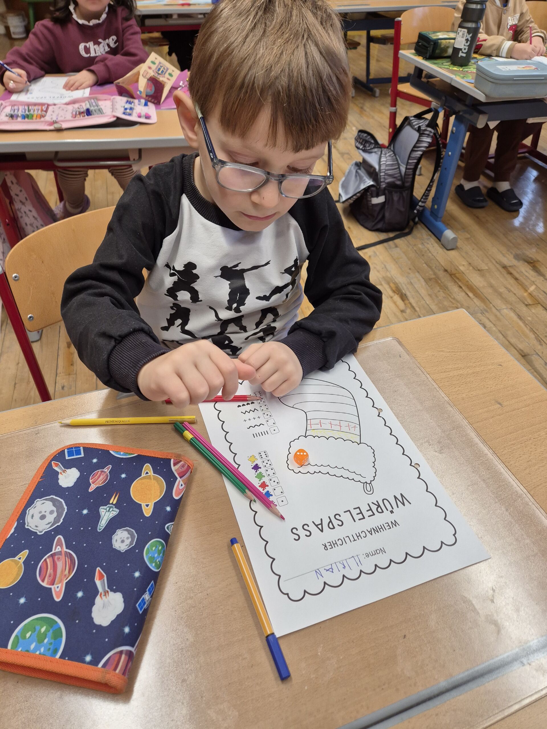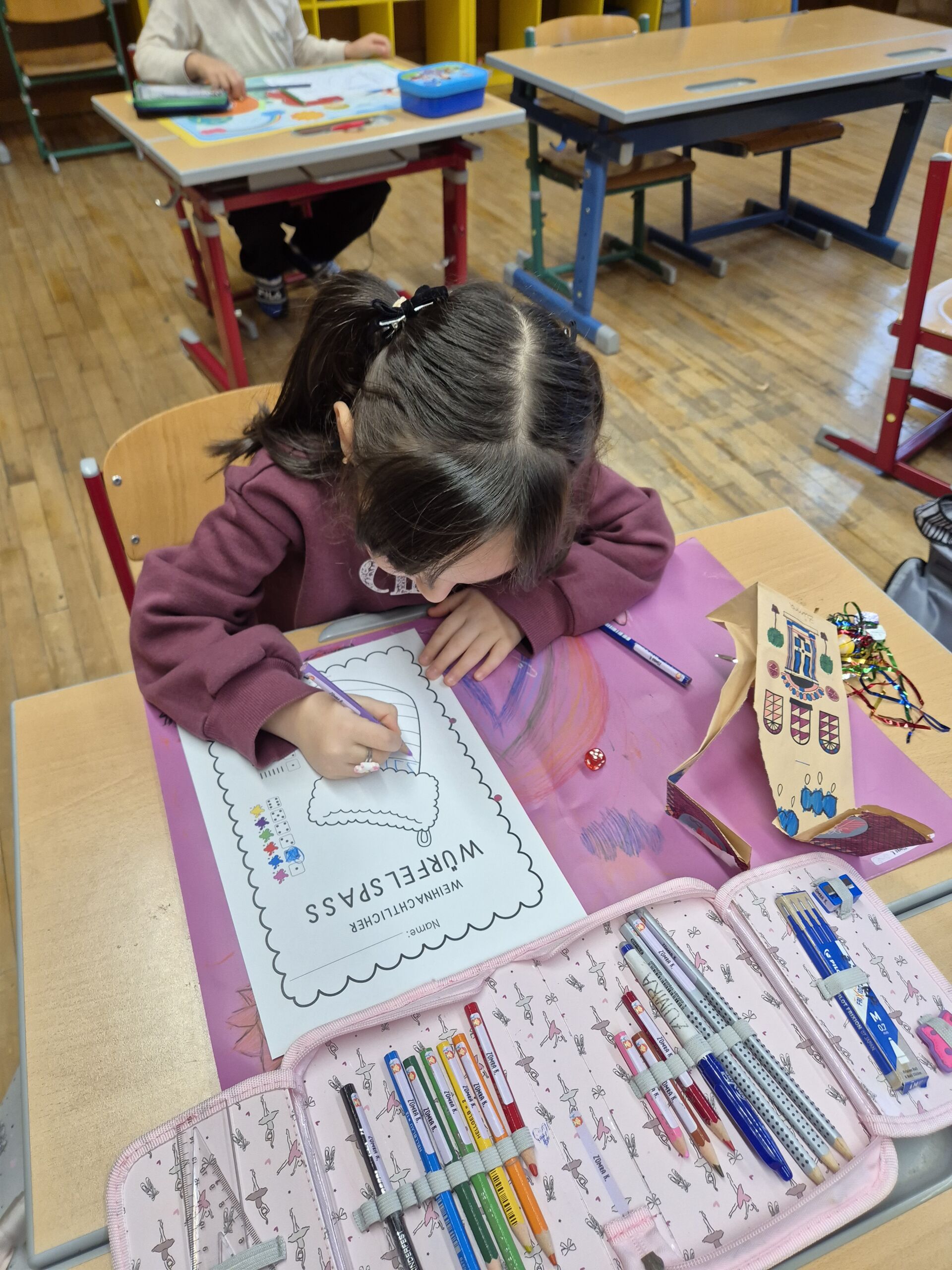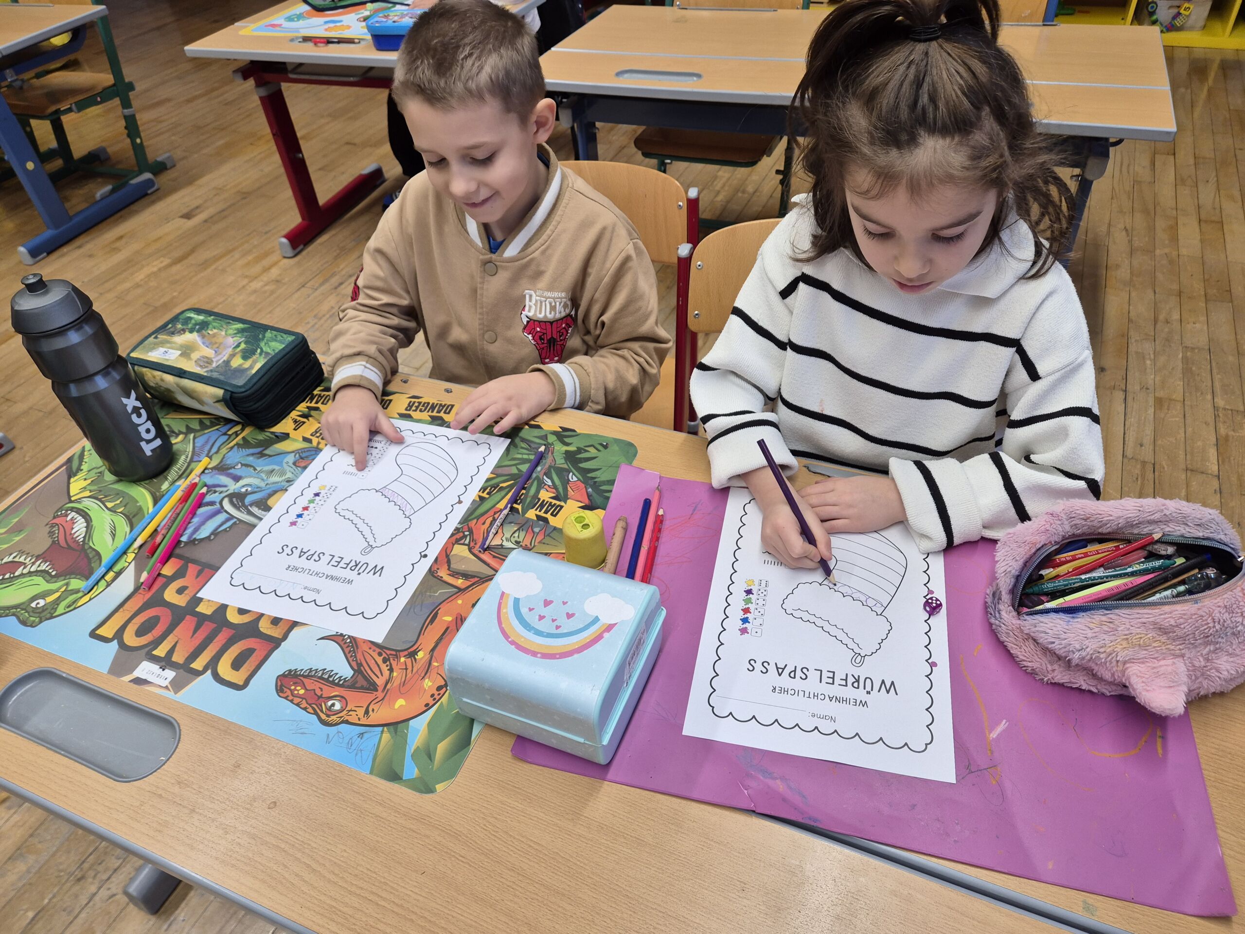 Die Kinder der Vorschulklasse 2 festigten den Zahlenraum 6 auf spielerische Weise. Zusätzlich zu der Erarbeitung der Ziffern, haben wir auch die Würfelbilder gelernt. Heute gestalteten wir grapho-motorisch einen Weihnachtssocken. Durch das Würfeln bekamen wir eine Angabe, in welcher Farbe und mit welchem Muster der Socken gestaltet werden soll. So hatte am Schluss jedes Kind ein individuell gestaltetes Werk.
